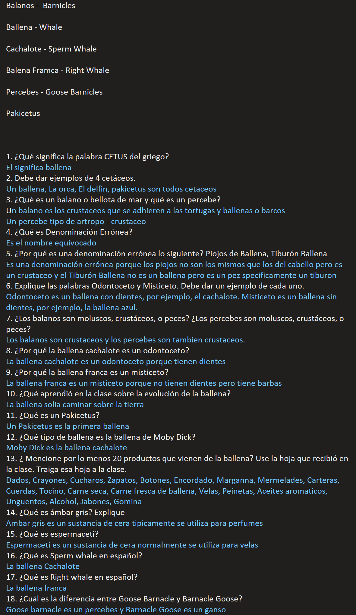 13. ¿ Mencione por lo menos 20 productos que vienen de la ballena? Use la hoja que recibió en la clase. Traiga esa hoja a la clase.