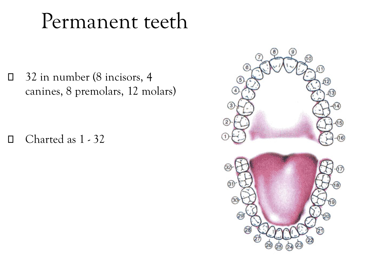 32 in number (8 incisors, 4 canines, 8 premolars, 12 molars)