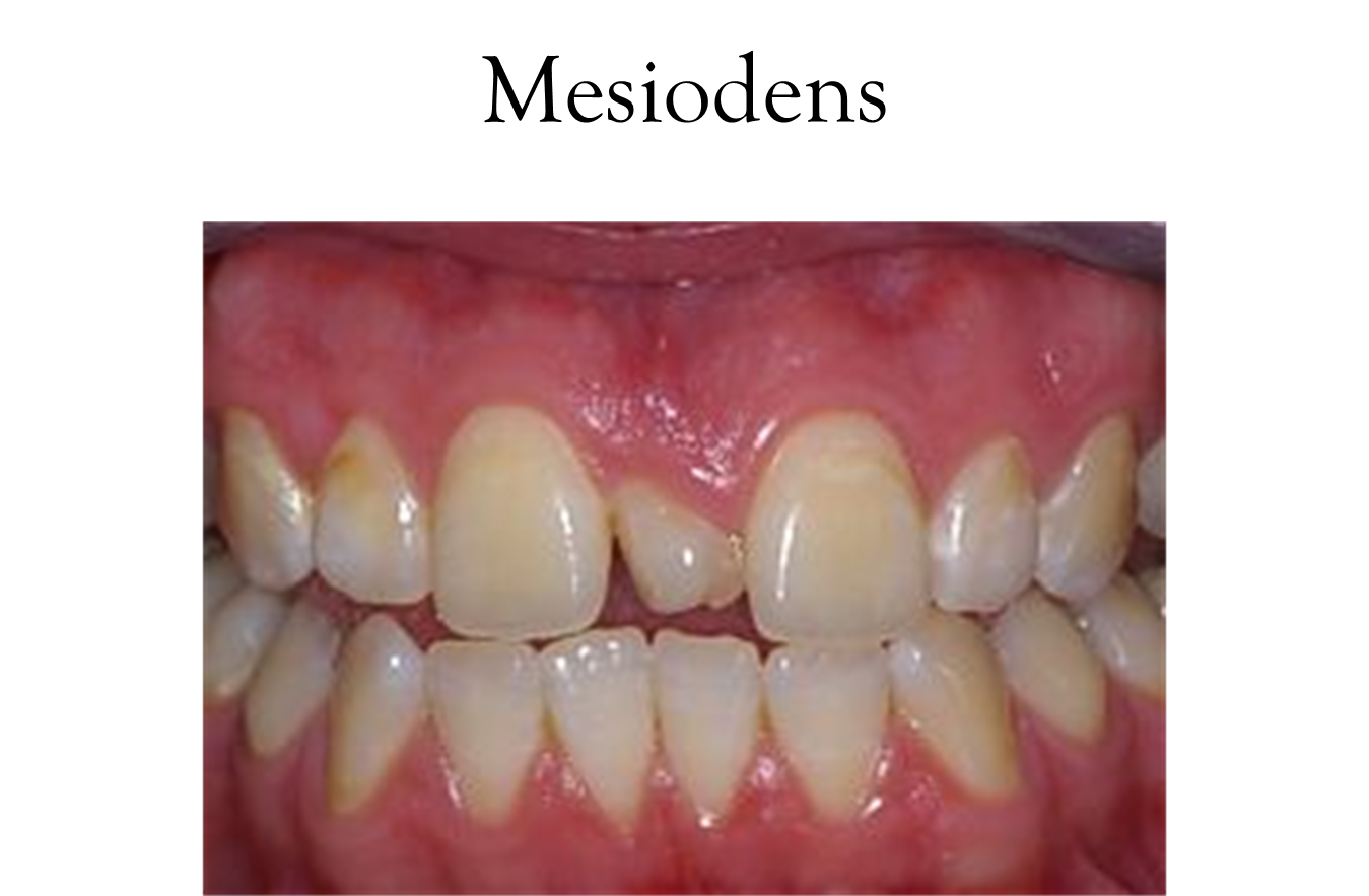Mesio= midline, Dens= tooth (i.e. central incisor)