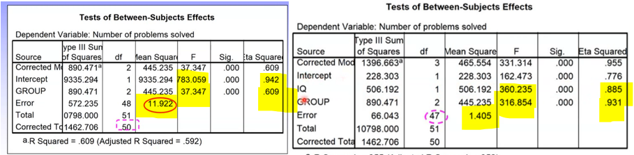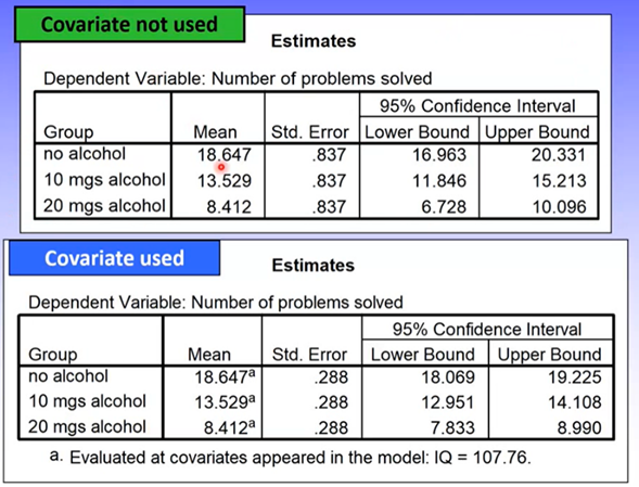 Example: IV = alcohol consumption, covariate = IQ, DV = problem solving ability
