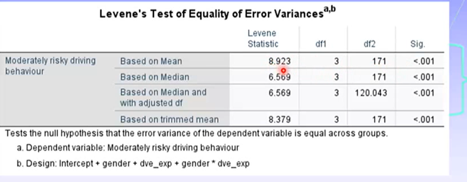 Tested using Levene’s test: p < .001 indicates homogeneity of variance has been violated (because it is a conservative test)