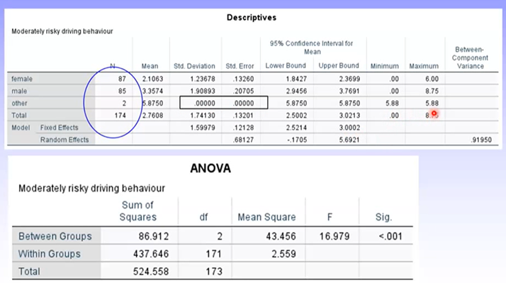 Can see the SD and SE for the other group is 0 – this is because they had the exact same score on the DV. ANOVA cannot be conducted accurately when there is such a small number of people in a group, and the SD = 0 – but SPSS will not know this automatically.