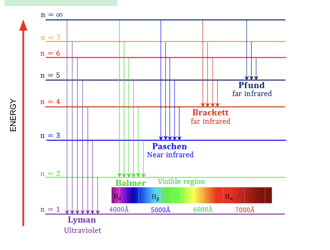 When electrons absorbs, heat or energy the go up energy levels, this is unstable so after some times they go down energy levels and emit photons at a specific wave length. Higher energy levels are closer together on the graph as they are closer on together in the atom, thus requiring less energy to move up and down. Each energy difference then refers to a specific wavelength. Use to prove the existence of energy levels