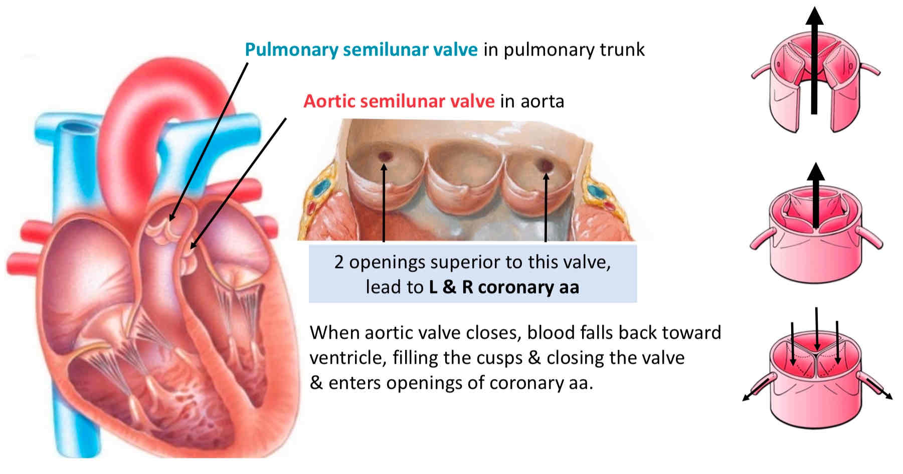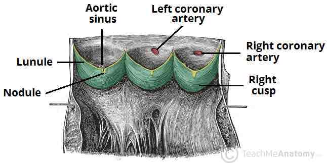 Left and right aortic sinuses mark origin of left and right coronary arteries. As blood recoils during ventricular diastole, it fills the aortic sinuses and enters the coronary arteries to supply the myocardium