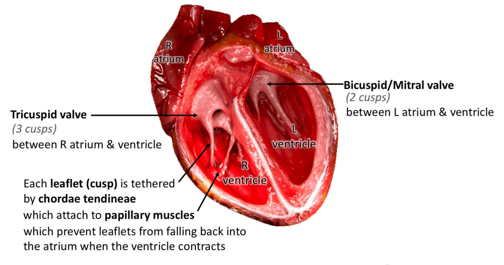 Chordae tendineae are attached to papillary muscles on interior surface of ventricles - these muscles contract during ventricular systole to prevent prolapse of the valve leaflets into the atria