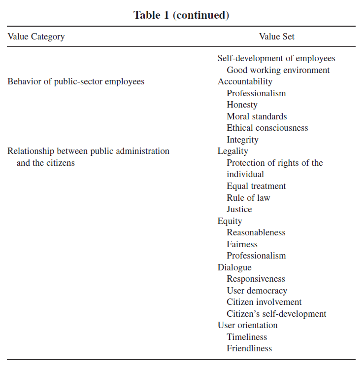 there are four groups of values that are mutually interrelated: robustness, innovation, optimal performance, and a good workplace. Four value clusters in the relationship between administration and citizen: the rule of law, professional discretion, citizen involvement, and customer orientation