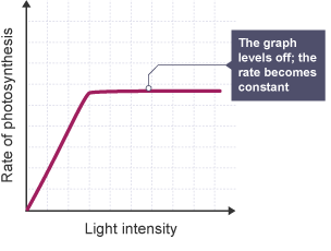 As light level increases the rate of photosynthesis increases steadily but only up to a certain level. Beyond this it wont make a difference. As light intensity increase the rate of photosynthesis will no longer increase. This is because temperature or CO2 level will be the limiting factor.