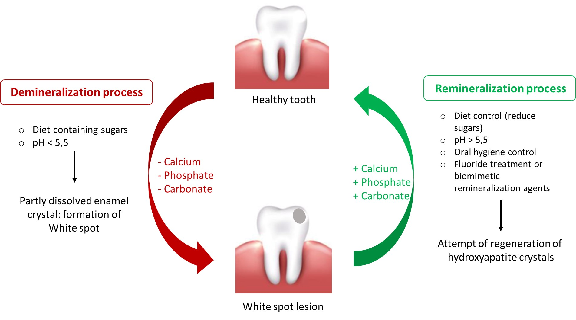 Demineralization: Acids dissolve enamel crystals (pH 5-5.5)