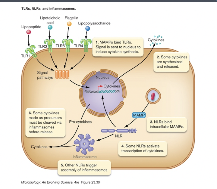 - bind to Toll-like receptors (in membrane) or Nod-like receptors (in cytoplasm)