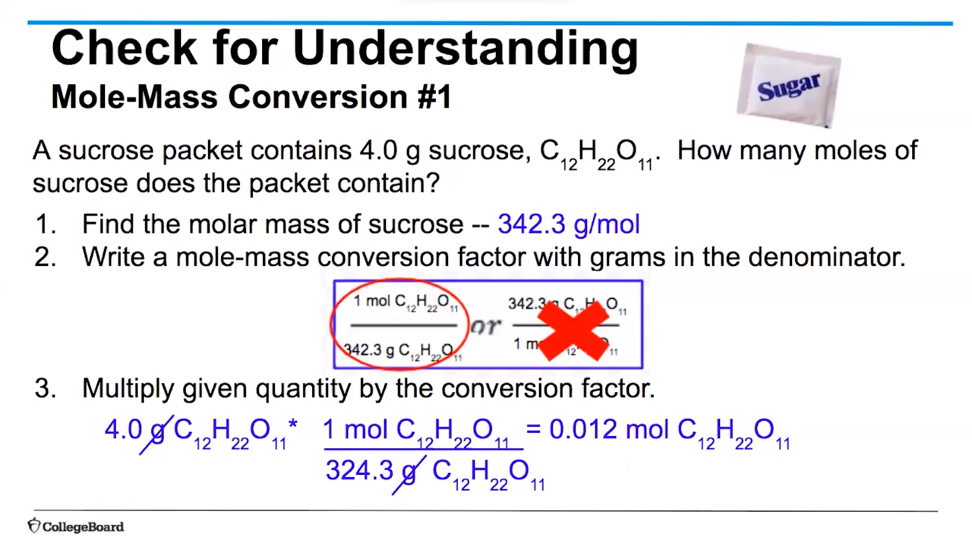 Eg. If you’re trying to find the moles use the converstion factor given to you and eliminate the grams you found in the denominator