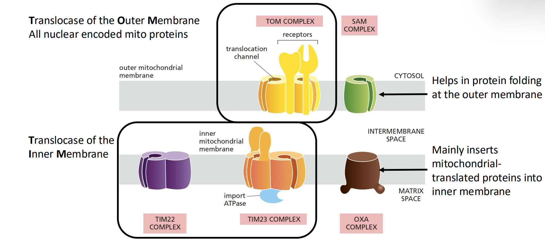 IM (Inner Membrane): TOM complex, TIM23 complex, N-terminal transmembrane domain