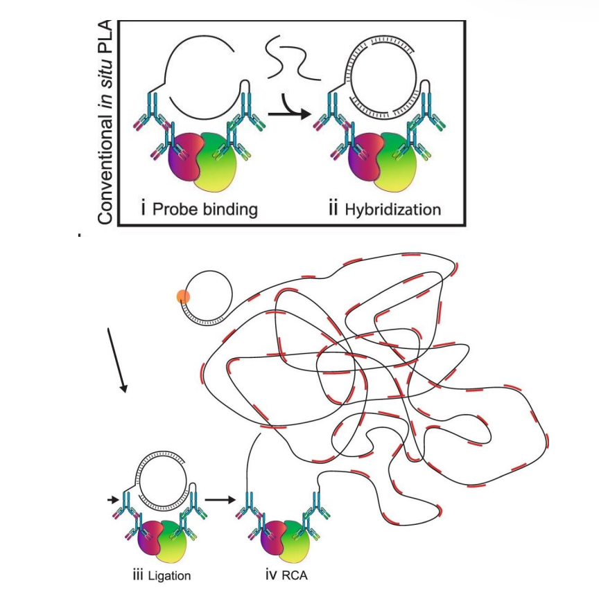 In the proximity of less than , the addition of two oligonucleotides connector hybridize with the probes and form a closed circle template in the presence of a ligase. This indicates that the target proteins are in close proximity.