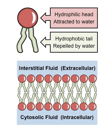 - %%Hydrophobic tail%%, repelled by water, %%on inside of cell surface membrane%%