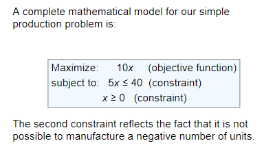 Objective Function - mathematical expression that describes the problem’s objective, such as maximizing profit or minimizing cost (10x)