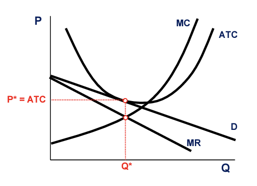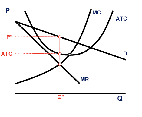 The difference between a monopoly and a monopolistically competitive firm is that there are barriers to entry for a monopoly, while there are no barriers to entry for a monopolistic competition. So, if firms are making an economic profit, more firms will enter, and we will eventually reach the following long-run equilibrium state.