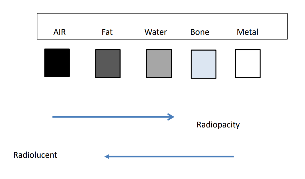 Soft Tissue/Fluid: more electrons are absorbed, around 1/2 reach cassette → medium grey