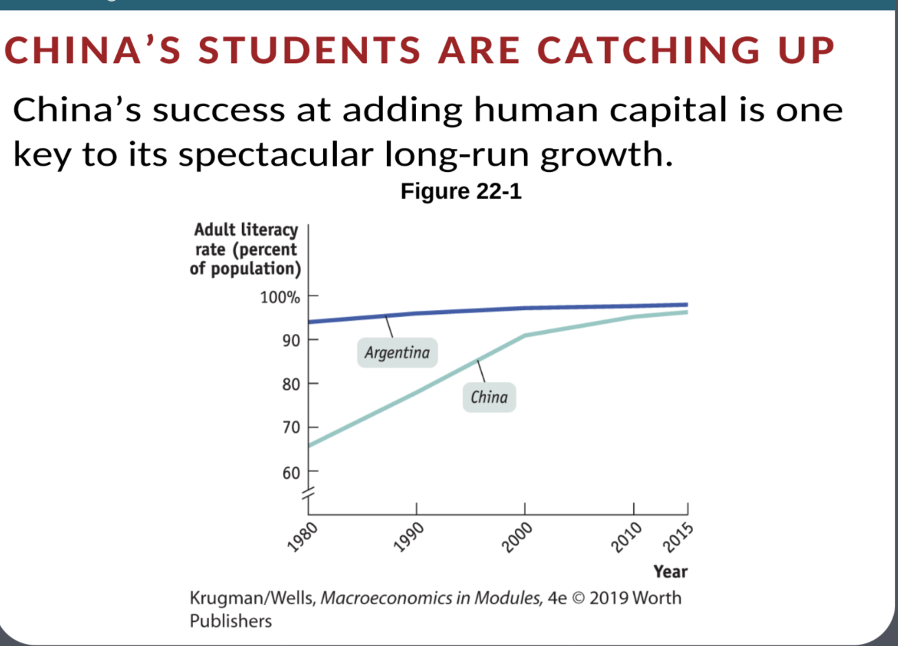 Example: China has demonstrated spectacular long-run growth, partly due to its success in rapidly adding human capital (e.g., increased student enrollment).