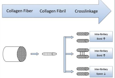 Scleral cross-linking causes increased stiffness of the scleral tissue by forming new covalent bonds between collagen fibres and decreasing the space between fibres.