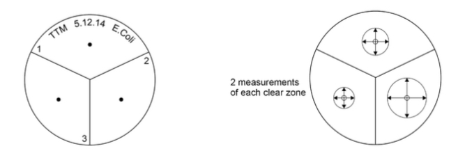 - Measure the diameter of the clear zones after 48 hours using a ruler. Take a second measurement at 90 degrees from your first measurement and take a mean for the diameter. Do not remove the lid when taking measurements.