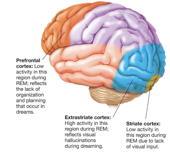 - activation of visual and auditory cortices→drea, liek imagery, most dreams occur during rem sleep