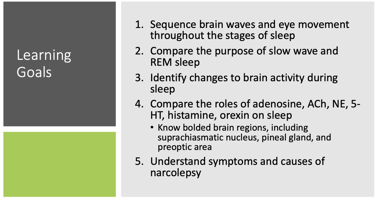 - sleep: state of continuous and long lasting unconsciousness, can be reversed rapidly and easily, driven by circadian rhythms, homeostatic factoy is the bodys drive to maintain a stable physiological state