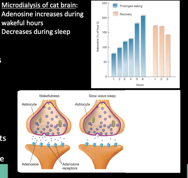 - homeostaticmechanism: 1. awake, stored sugar in astrocytes is broken down, 2. extracellular adenosine increases, 3. accumulation of adenosine inhibits neural activity, 4. sleep, astrocytes renew sugar storage