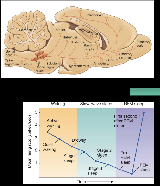 * raphe nucleus: pons region, serotonergic release throughout the brain