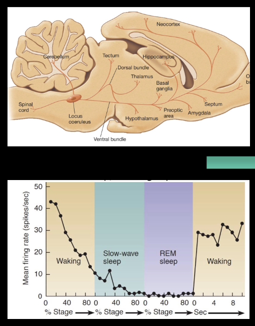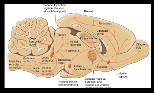 * locus coeruleus: dorsal pons region, noradrenergiv release throughout the brain