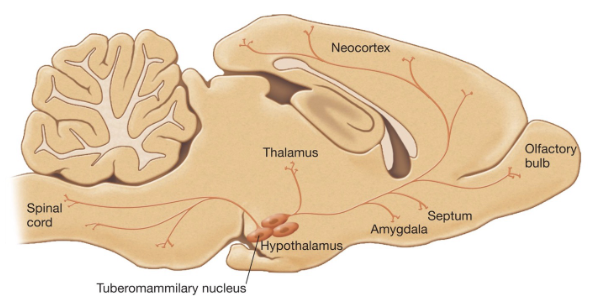 * tuberomamillary nucleus: hypothalamus, histaminergic release throughout the bein, direct activation at cerebral cortex, indirect activation at basal forebrain and pons via ACh