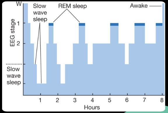 - sleep cycling: awake, 1.5 hour non-REM sleep stages 1,2,3, REM sleep consisting of rapid eye movements and dreaming, return to non-REM
