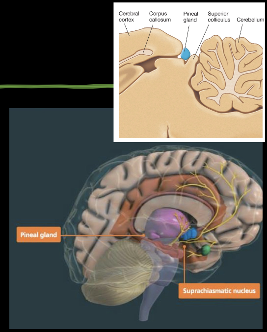 * entrainment: synchronization with the 24hr light/datk schedule - pineal gland: dorsal to the midbrain, rostral to the cerebellum, regulates seasonal rhythms, SCN triggers mineal gland to secrete melatonin, hibernation