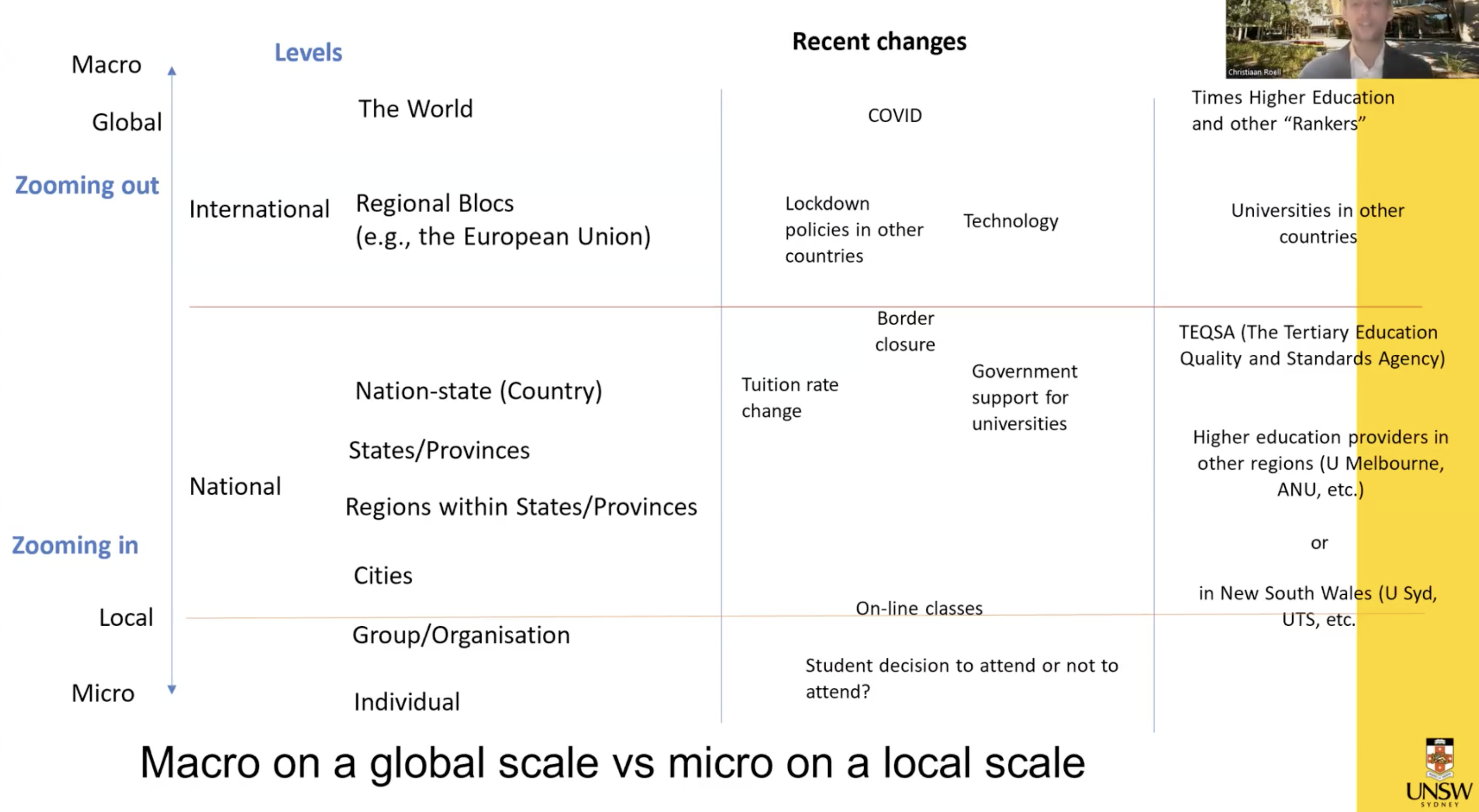 Referring to the diagram, think about individual decisions; for example, whether to attend a lecture or not. Professors have to decide whether to do the class online or in person. During the pandemic, lectures had to be fully online. There are different stakeholders which are important at different levels; at the micro level, that is UNSW, at the national level, there are different bodies that look at education standards, and we also have organisations that provide rankings for universities across the globe – these, therefore, are the stakeholders at the global level. Stakeholders differ by level (students & lecturers ↔ accreditation bodies ↔ global university rankers).