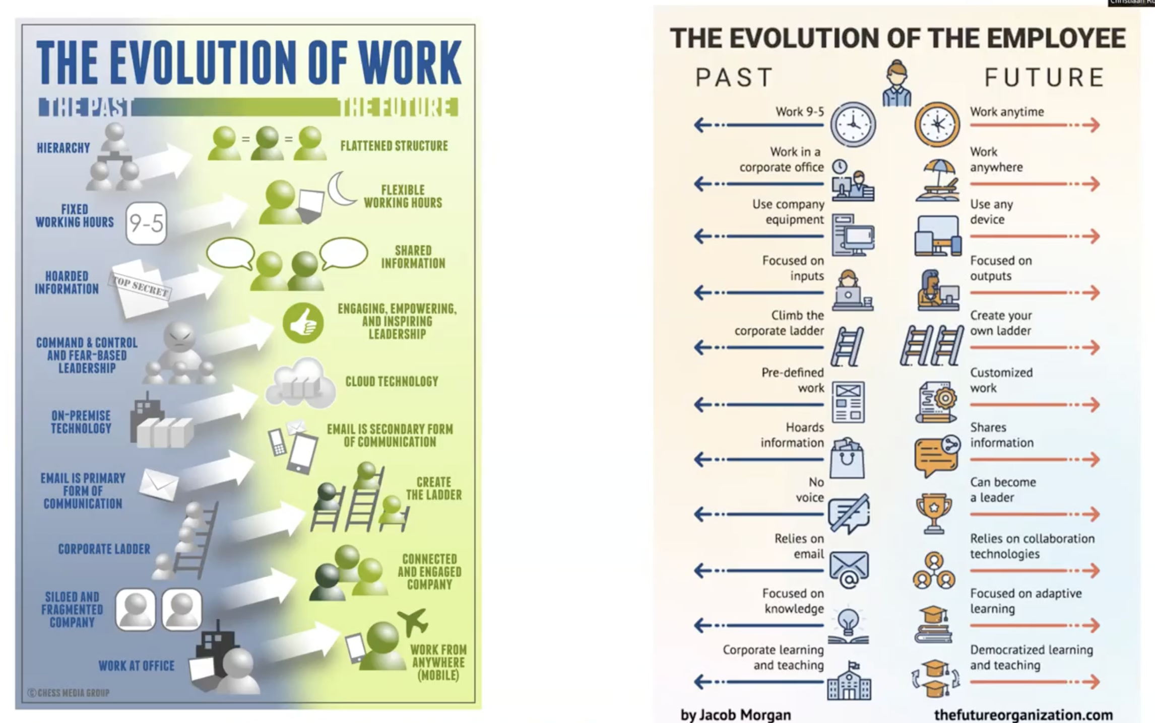 Evolution of work table: fixed hours → flexible (not always good because companies want you to be available all day and night; therefore working more rather than less); office → anywhere (different cities, countries); local staff → distributed teams