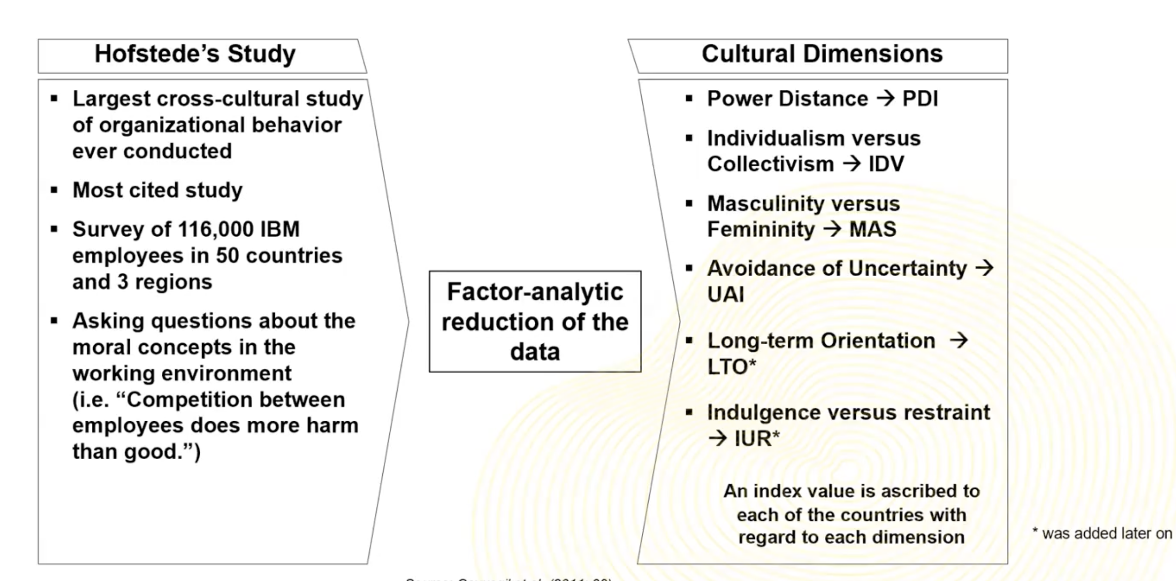 Geert Hofstede conducted one of the largest cross-cultural studies of organizational behaviour, focusing on cross-cultural differences. It outlines the key dimensions along which national cultures differ. Study was of over 100,000 people, all employees of one organisation, IBM, in 50 different countries and in three regions.