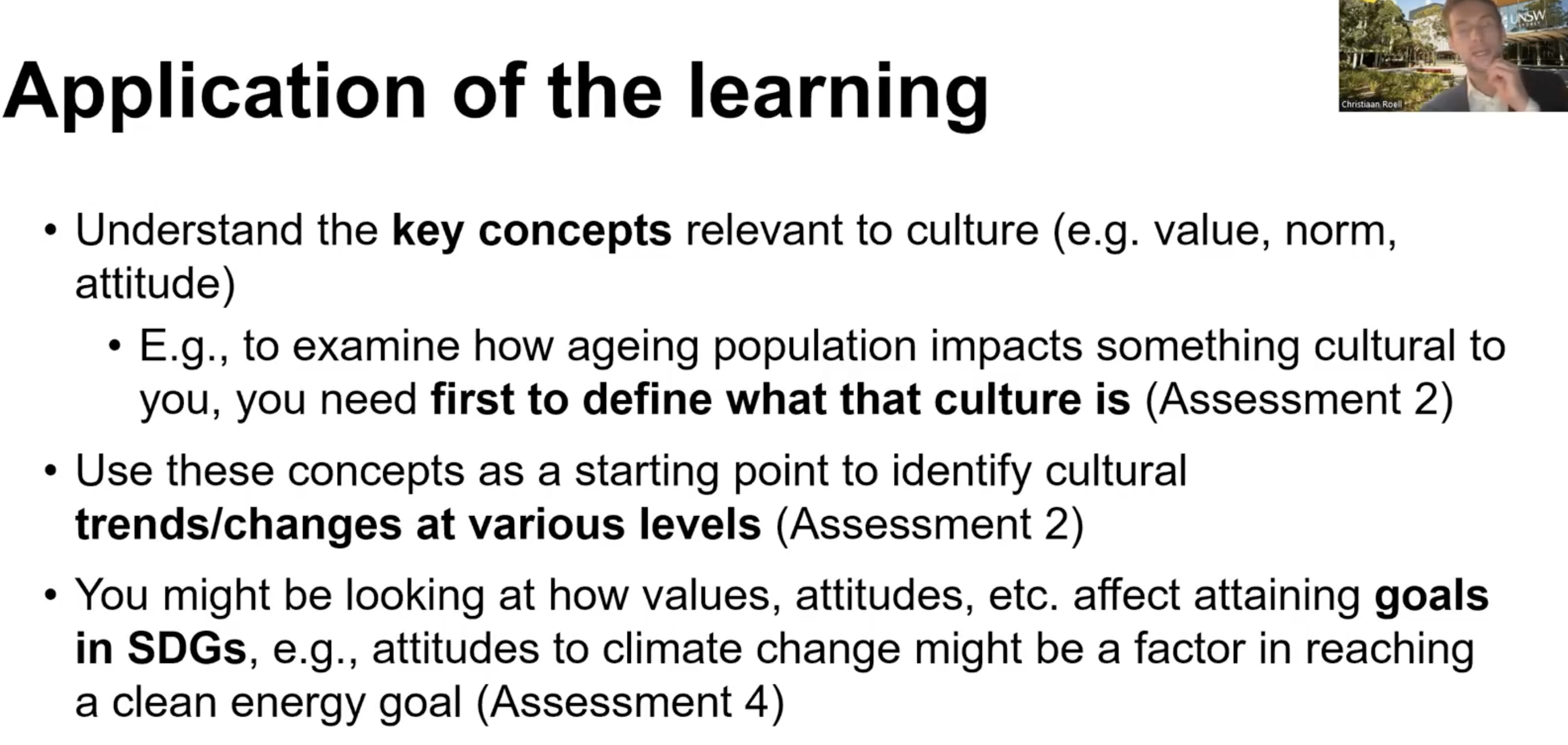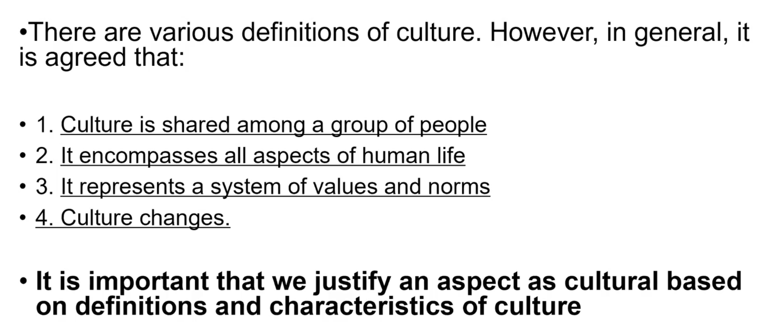 We need to understand the key concepts relevant to culture; values, norms, attitudes et cetera, for example to examine how an aging population impacts something cultural. We need to first define what the culture is and explain why something is cultural; one way of doing that is linking it back to the characteristics of culture. You want to explicitly state this and you also want to link it back to a definition; one definition is plenty, but you want to make sure that you link it back to the things we discussed in the lecture and link it back to the definitions that experts in the field came up with. So, you need to clearly define what culture is.