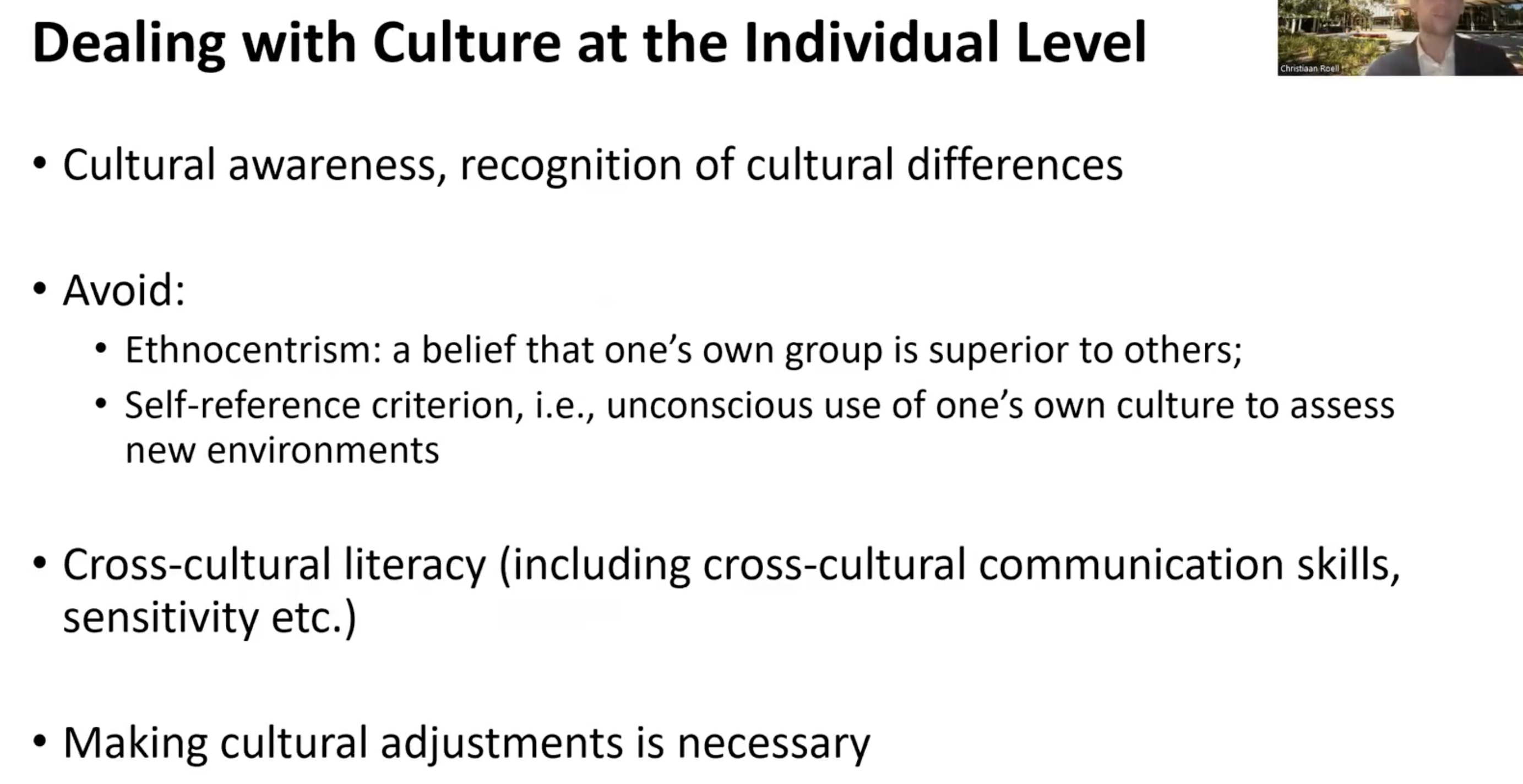 Cross-cultural communication skills, being sensitive, being aware of your kind of own biases that you have, making cultural adjustments, make friends locally, study the culture, read about the culture, talk to a lot of people, learn the language, all of these things help you kind of understand culture in international contexts.