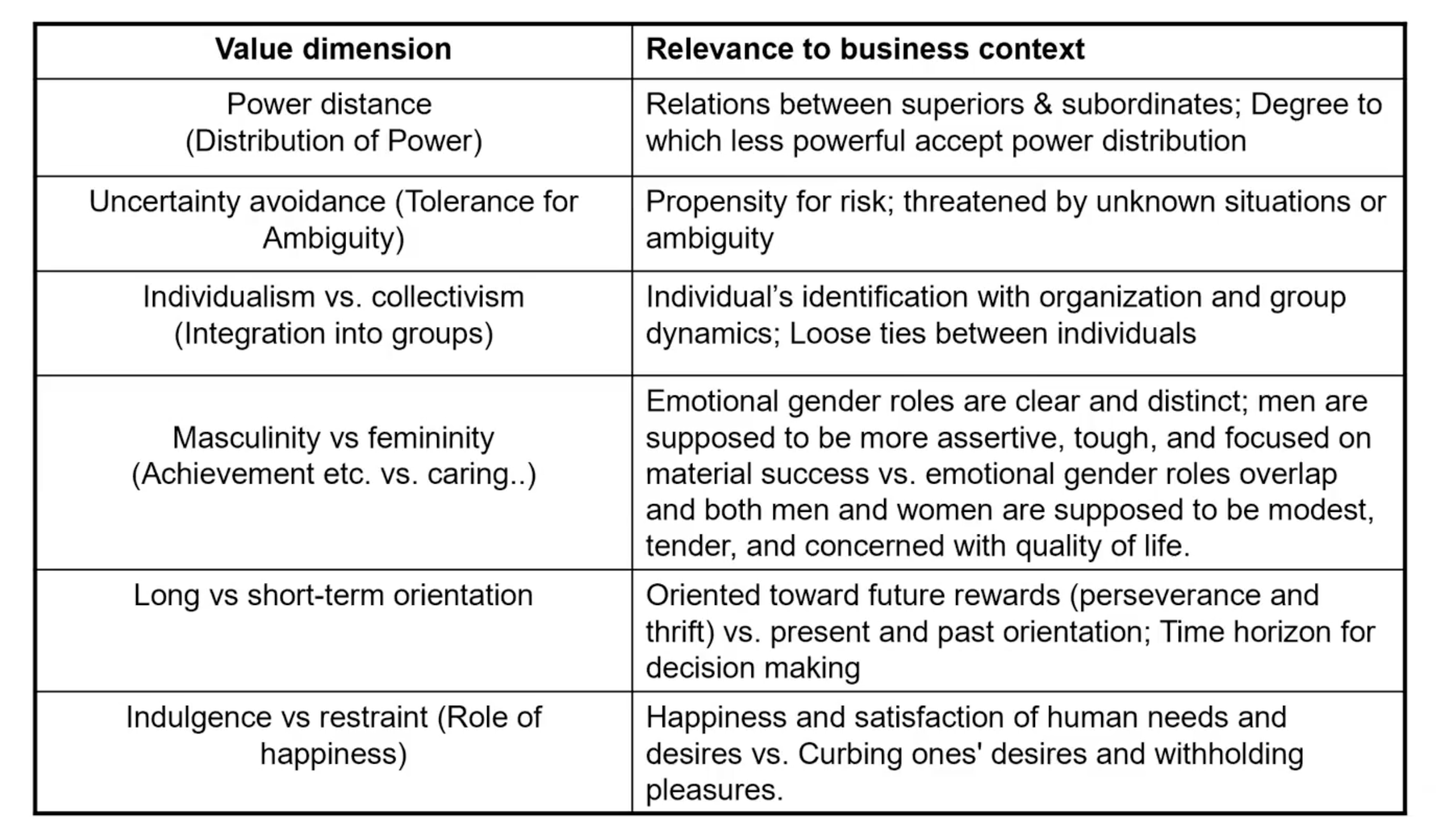 Essentially, differences between countries can be analysed using the different dimensions, with countries being scored on the different dimensions. Use website to do this. It is good for looking at what it actually means for organisations and maybe for HR policies et cetera.