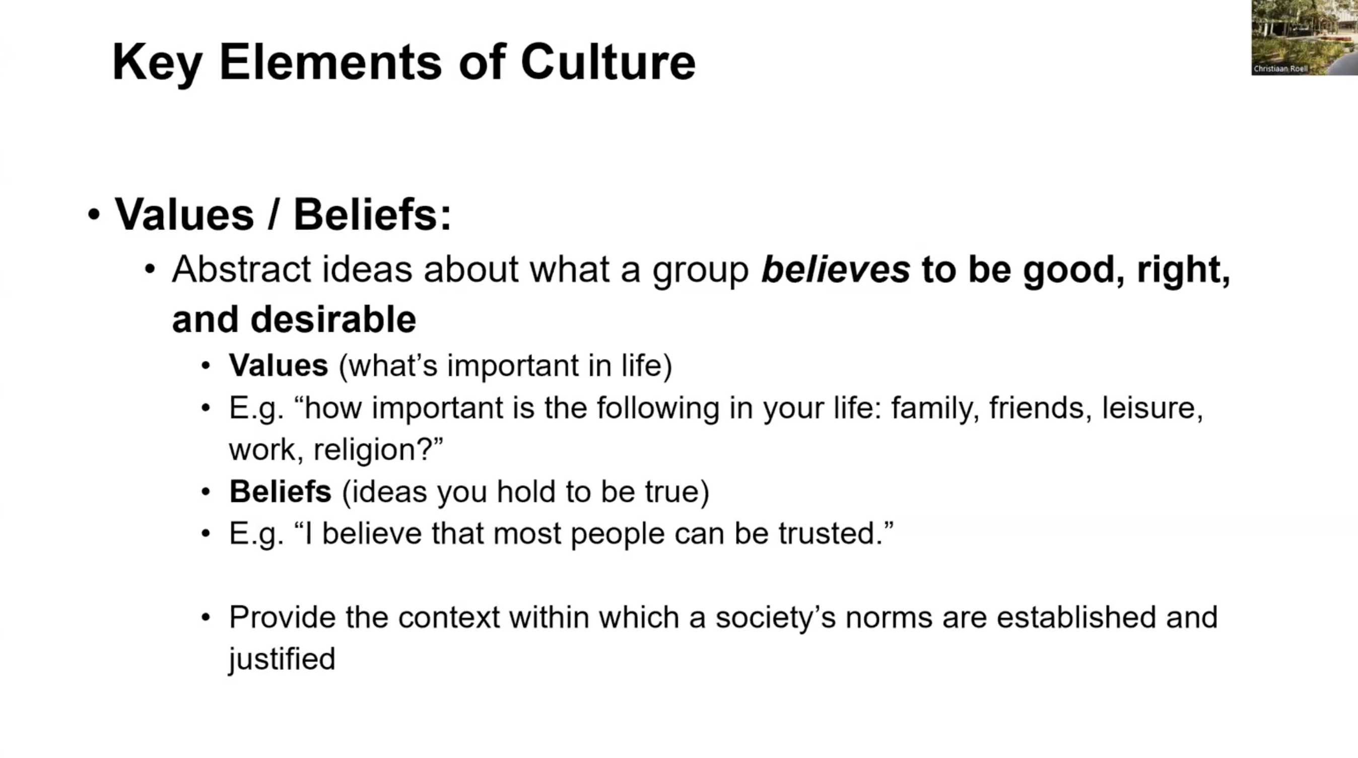 Values: abstract ideas of what a group believes to be good, right and desirable (e.g., education, work, religion, rights).