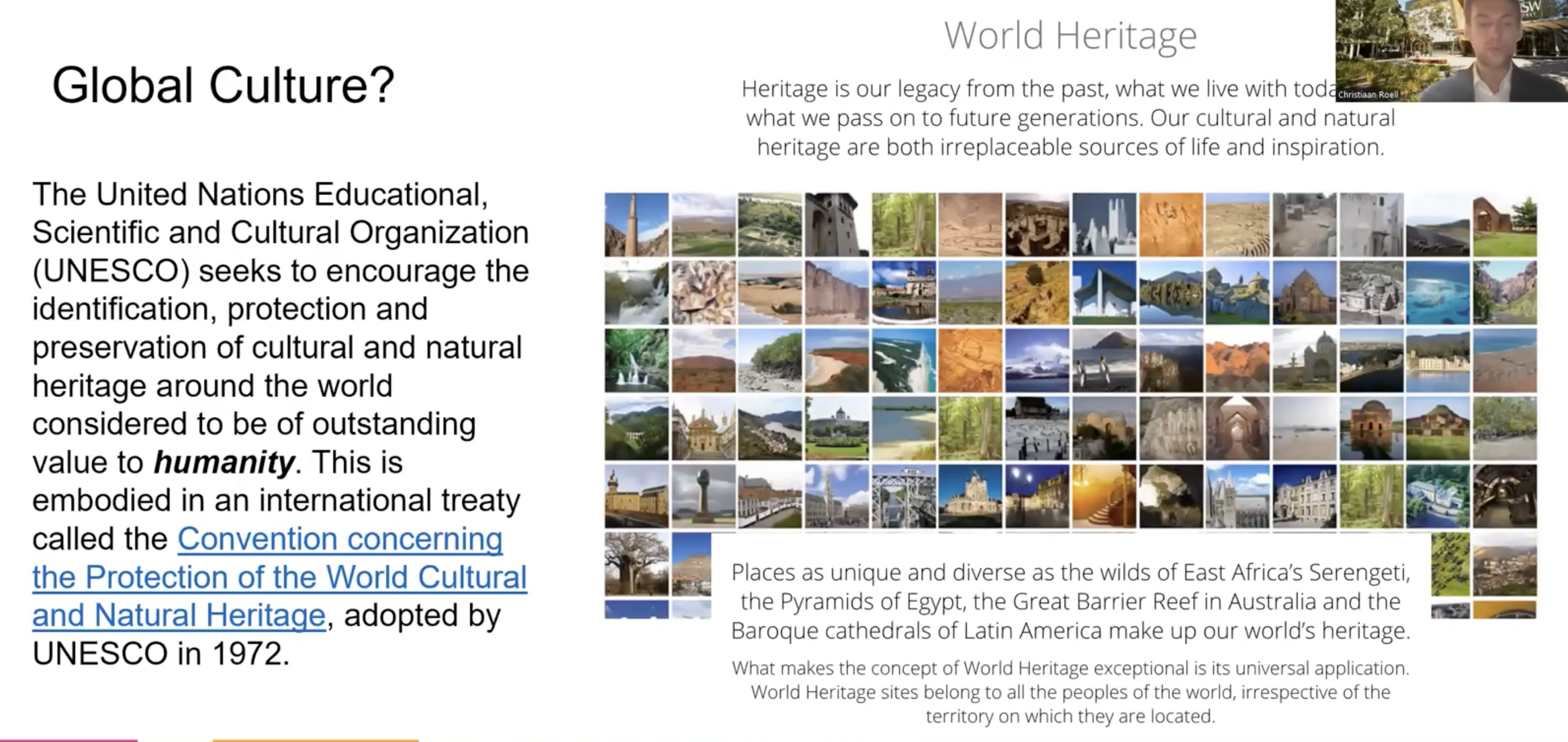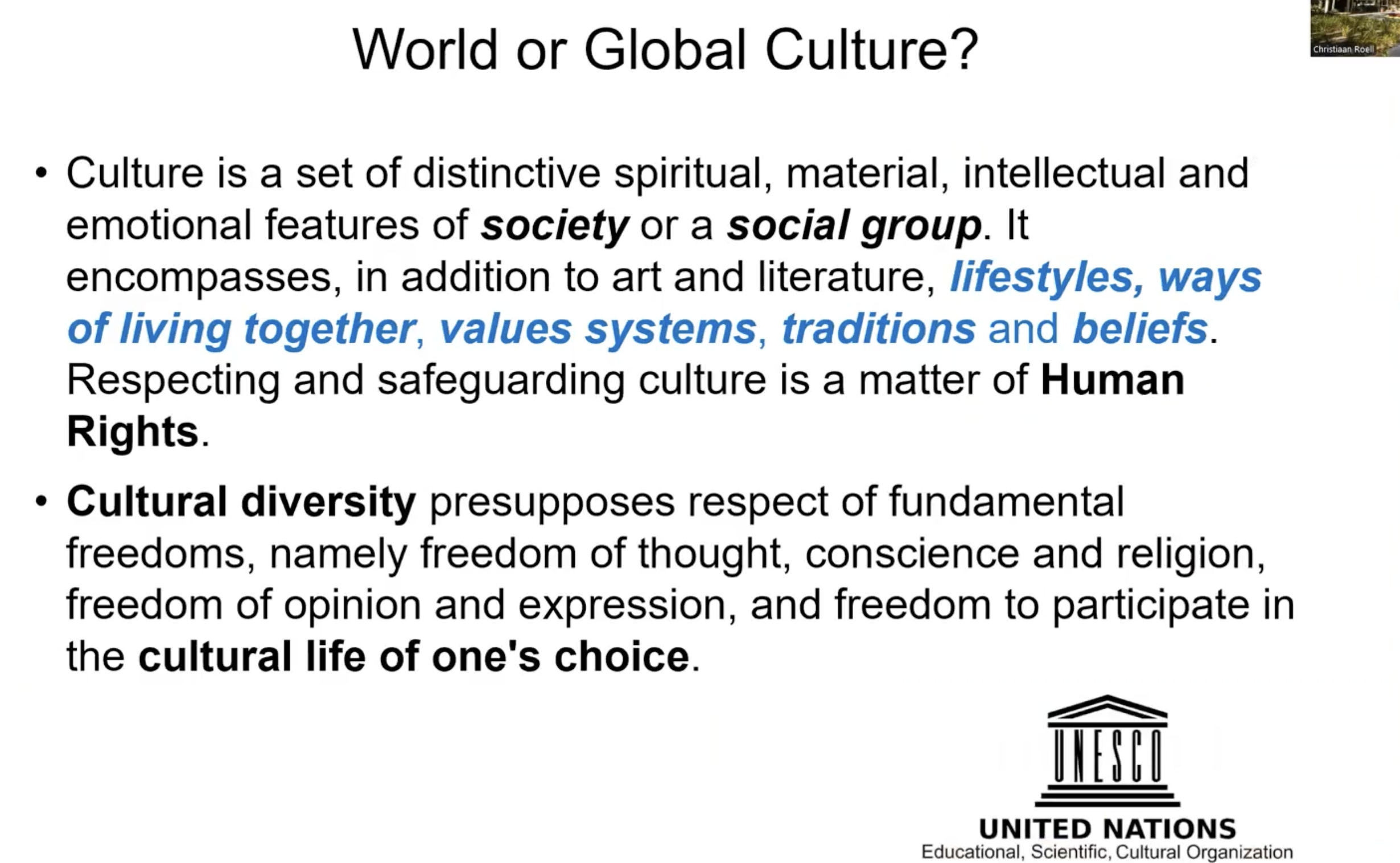 Following UNESCO, this involves respecting fundamental freedoms, freedom of thought, freedom of religion, freedom of opinion. This is essentially global culture; so global culture is essentially cultural diversity. UNESCO are trying to encourage the protection and preservation of cultural and natural heritage around the world, which is kind of considered to be an important value to humanity. And they argue that this diversity is part of this, is part of global culture.