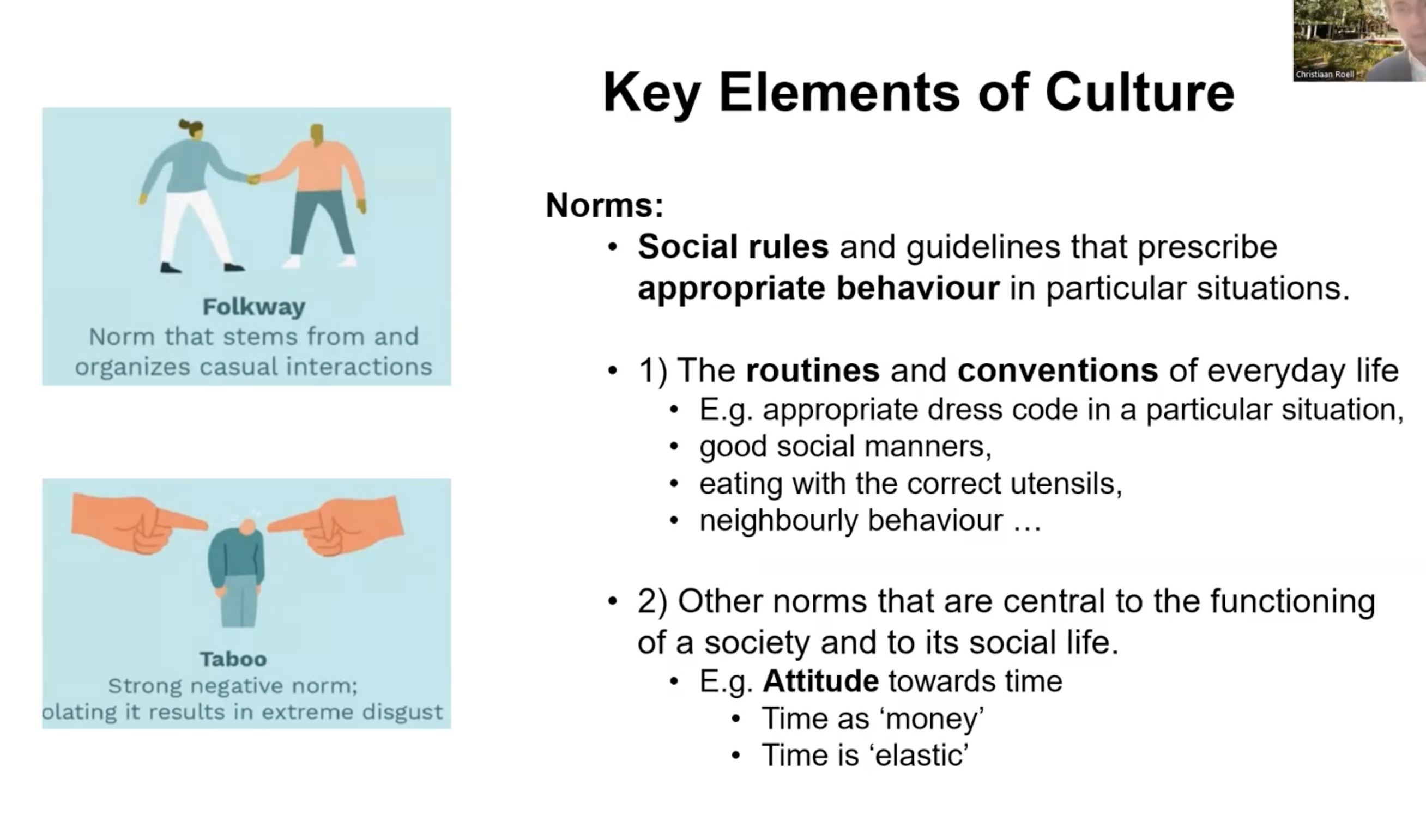 Norms: social rules/expectations that prescribe appropriate behavior in a particular situation (greetings, dress codes, work hours)