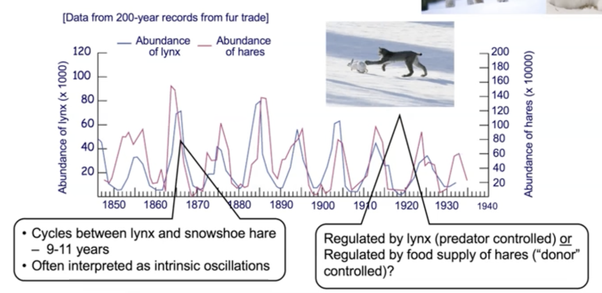 Iconic Example of prey oscillations: Hare and Lynx population oscillations.