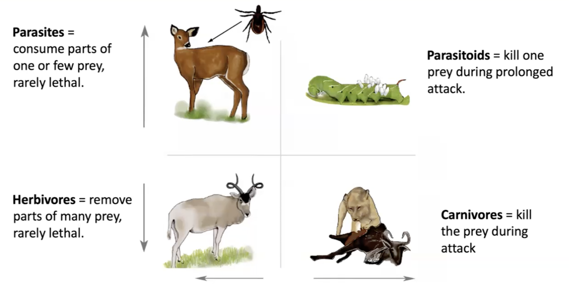Exception: Parasitoids (e.g., parasitoid wasp) lay eggs in a host (e.g., caterpillar), and the larvae feed off the catapillar and eventually kill the host. Highly specialized interaction with significant impacts on host populations.