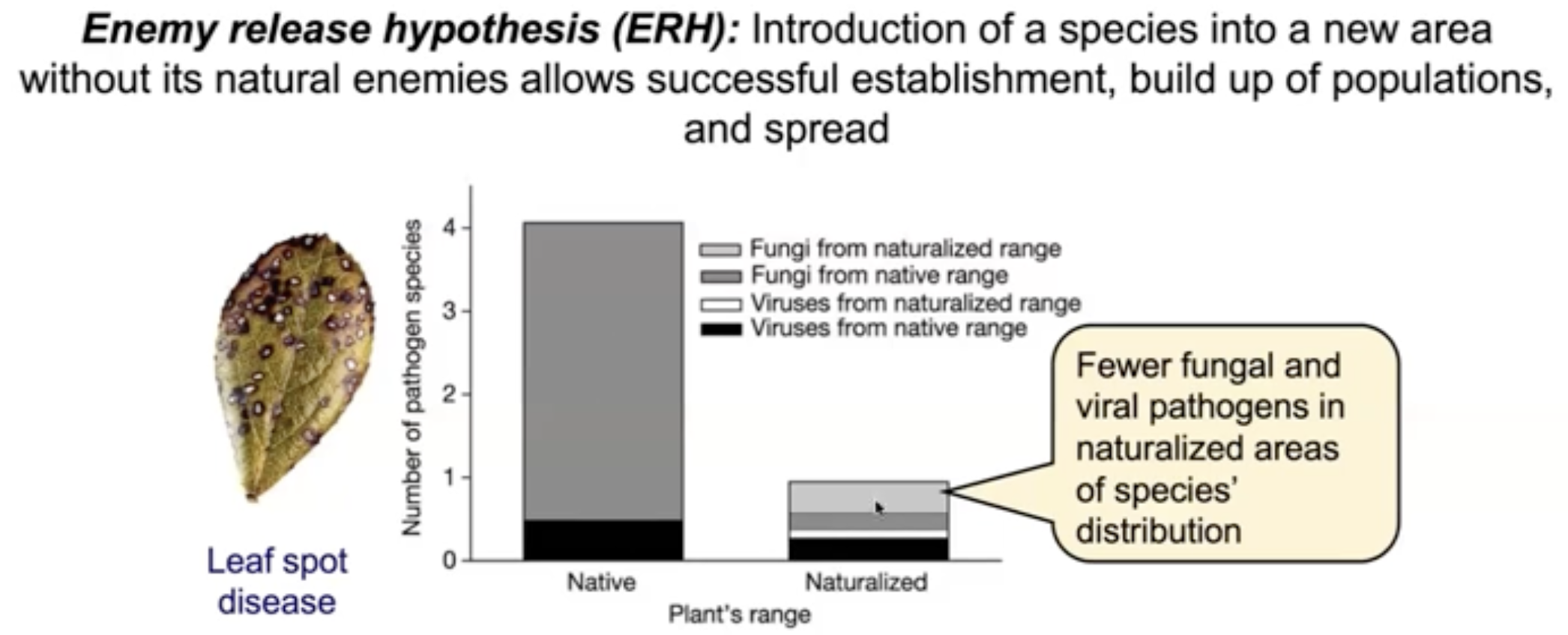 Plants in their native range have many pathogens, but when moved to a new naturalised range/environment where it has not existed before, they have fewer pathogens and can spread more easily.