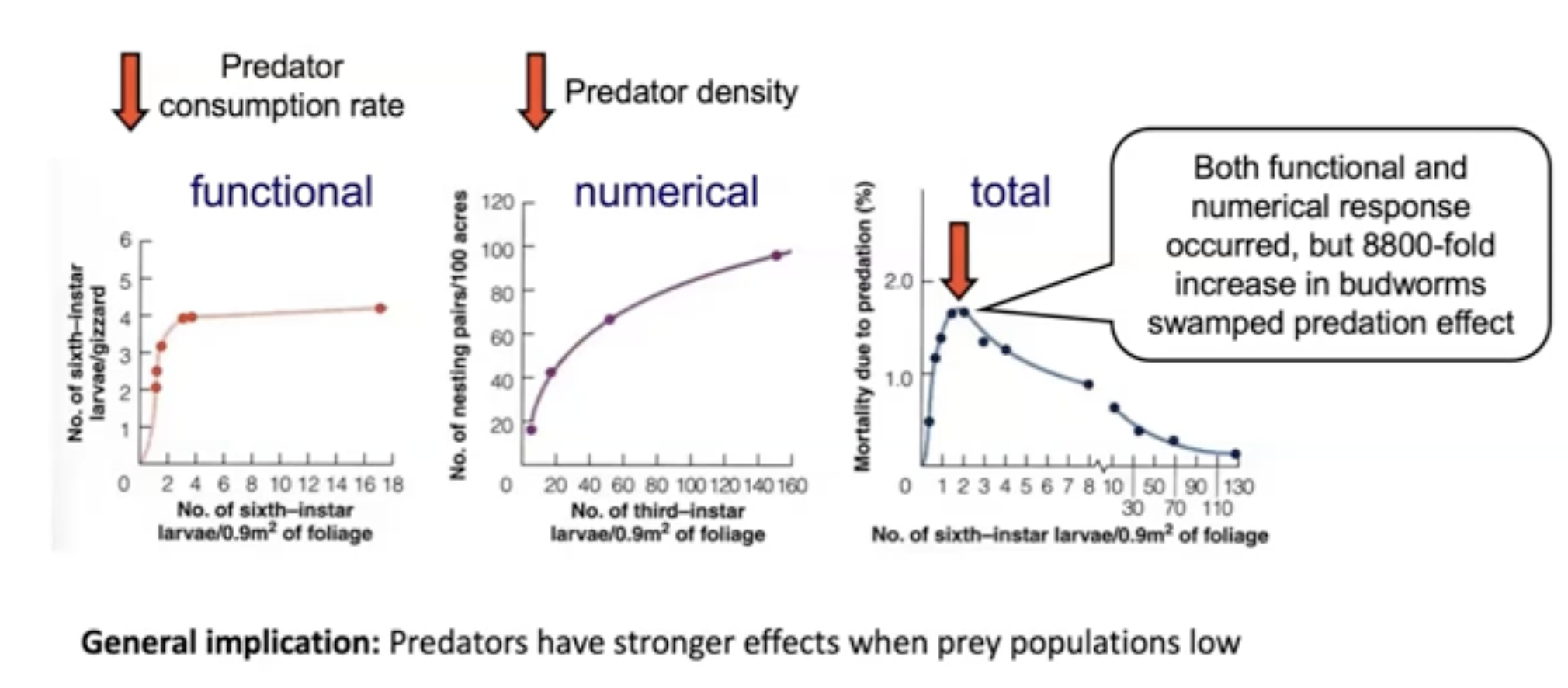 Combined functional and numerical response: As the number of larvae increases, so does predation, but the predator effect may be small at high prey levels due to satiation and other factors.