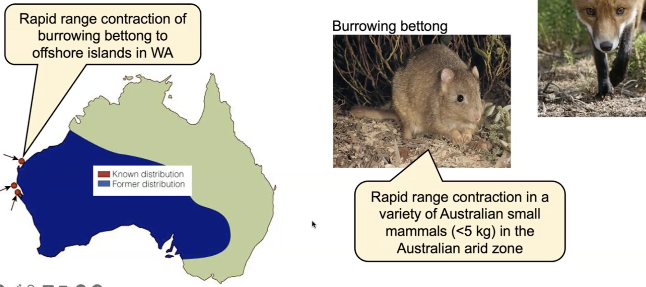 Range Contraction: Burrowing bettong in Australia disappeared from mainland due to predation by the introduced fox. Illustrates the devastating impact of introduced predators.