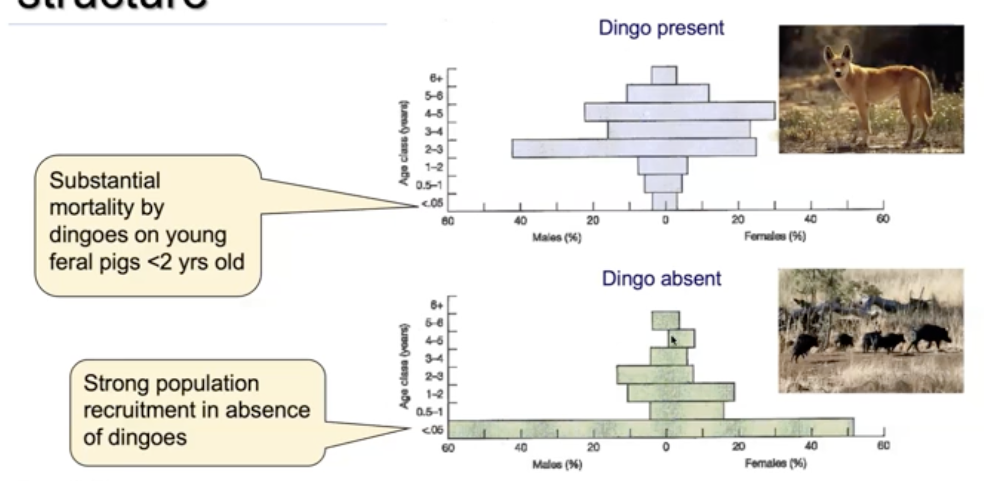 When dingoes are present, mostly older pigs survive because piglets are easy targets (small, easier to eat, can’t defend themselves very well) , leading to an older population structure.