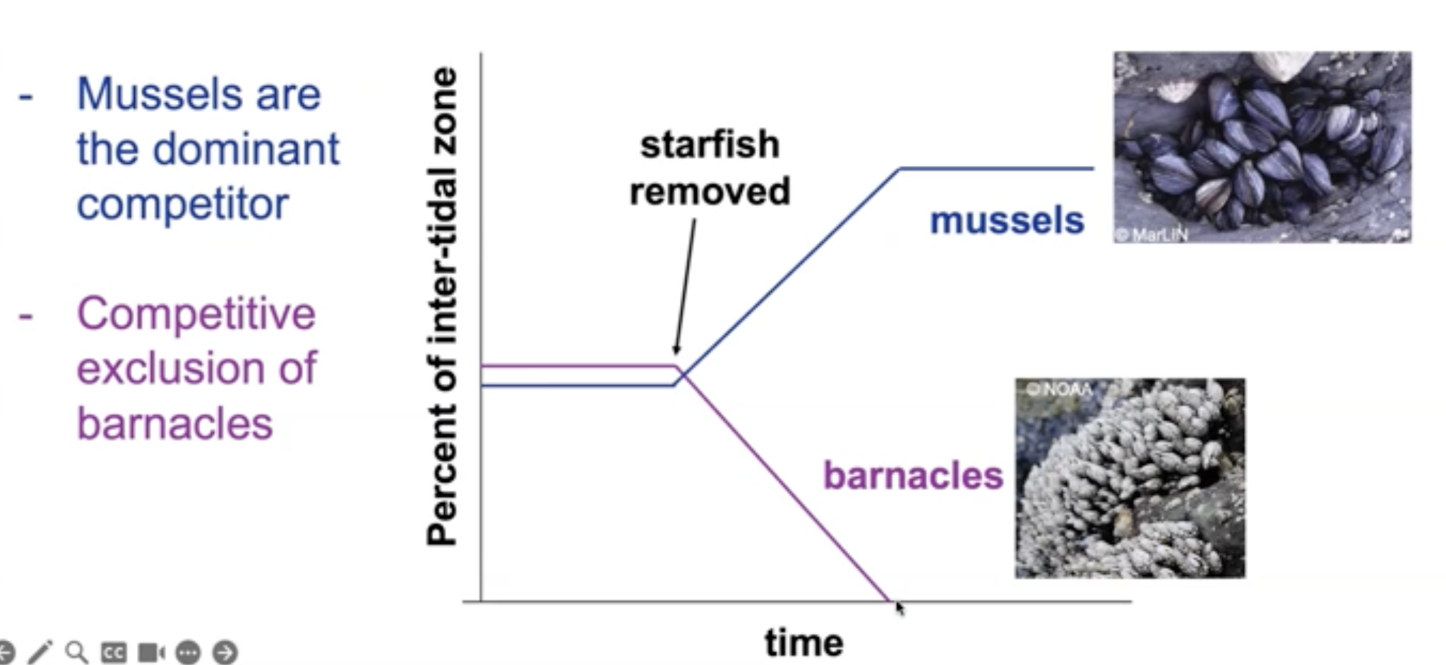 So it seems that perhaps the starfish prefers to eat the mussels when both species are present, and this meant that the mussel populations were suppressed, which allowed both the mussels and the barnacles to coexist.