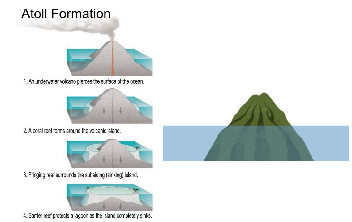A coral reef progresses from a fringing reef to a barrier reef to a coral atoll.