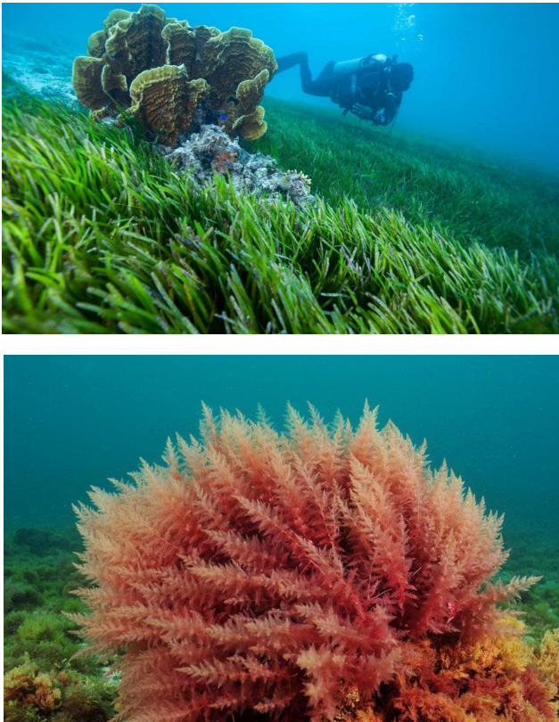 Shallow areas(where there is light for photosynthesis) contain seaweeds and filamentous algae