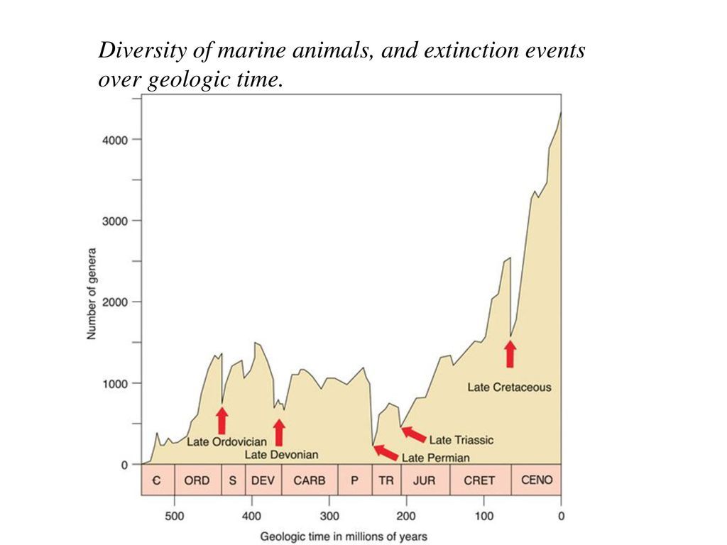 Permian-Triassic Extinction (~252 mya): The largest extinction, eliminating ~90% of marine species.